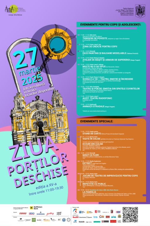 În 27 martie, de Ziua Internațională a Teatrului, vă invităm la Ziua Porților Deschise - ediția a XV-a pentru a sărbători împreună lucrurile pe care le iubim la arta teatrului - povești, joacă, măiestrie, comunitate! Începând cu ora 11:00, deschidem clădirea Teatrului Național și o umplem cu evenimente și activități pentru cei mari și pentru cei mici: spectacole, ateliere, discuții, instalații!