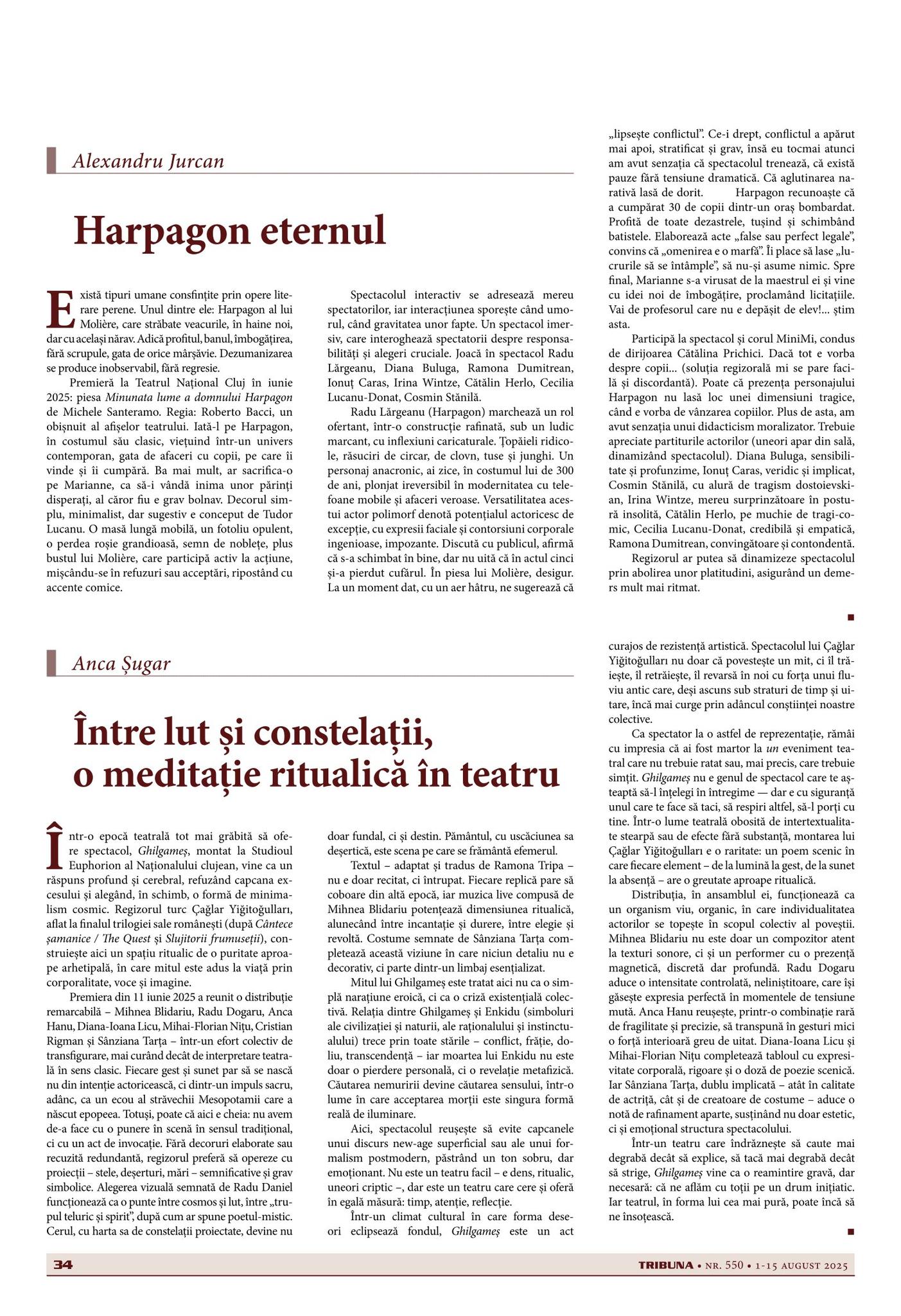 Ҫağlar Yiğitoğulları: Da, este al treilea spectacol dintr-o trilogie... Ar trebui să-ți spun ce anume unește aceste spectacole și de ce le consider o trilogie. În primul (Cântece Șamanice / The Quest n.n.), un grup de oameni își caută liderii, pentru ca în final să-i găsească în ei înșiși. Acolo aveam de-a face cu o căutare individuală. În al doilea spectacol (Slujitorii frumuseții n.n.), am vrut să tratez ideea de a fi lider într-o situație dificilă și m-am inspirat din Mahābhārata unde, în secțiunea Bhagavad Gita, Arjuna se confruntă cu decizii cruciale ca lider al societății și trebuie să se hotărască să meargă la război. Totodată, el comunică cu divinitatea. Și această idee, a comunicării cu o figură divină, m-a inspirat să scriu Ghilgameș, pentru că, într-un fel, am vrut să urmăresc zbaterile zeilor - Ghilgameș este muritor, însă este și două treimi zeu. A fost înzestrat la naștere cu forță și cu frumusețe, dar din păcate este totuși muritor. Așa am făcut legătura între spectacole. Primul începe cu o misiune, iar al treilea se încheie cu o misiune. Și, ca o altă conexiune, ultimul lucru pe care Krishna îl spune în Slujitorii frumuseții este că nu știm decât că nu știm nimic. Iar în acest spectacol tot ce știm este că toți murim.