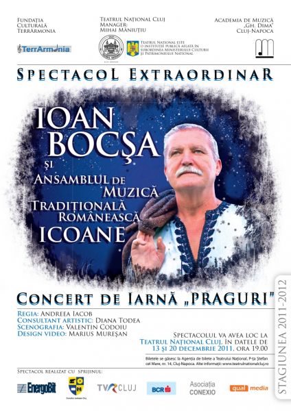 Teatrul Național din Cluj vă invită marți, 13 decembrie a.c., ora 19:00, în sala mare de spectacole, la premiera spectacolului PRAGURI - CONCERT DE IARNĂ, spectacol extraordinar susținut de Ioan Bocșa și Ansamblul de muzică tradițională românească „Icoane“.