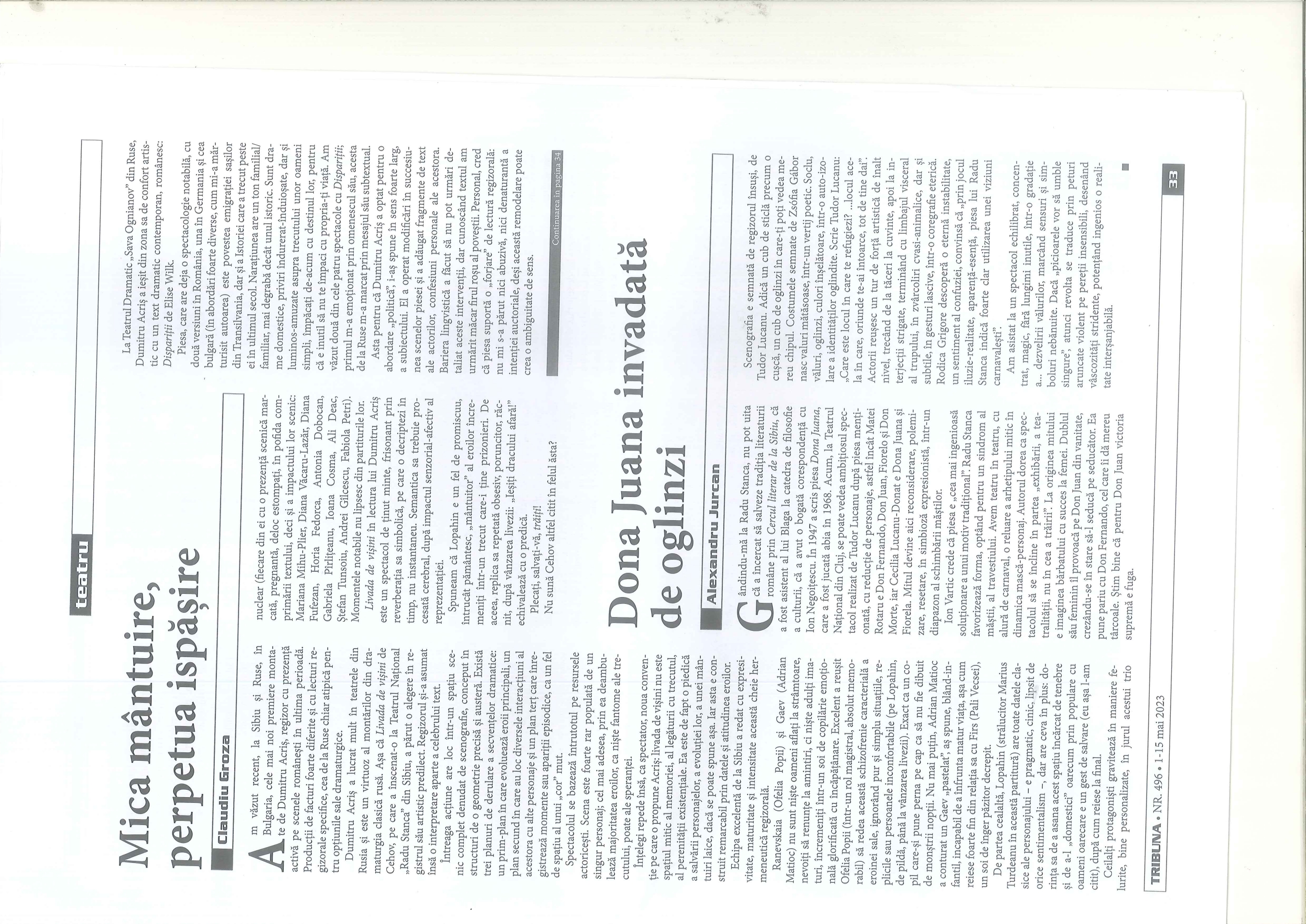 T.L.: Am adus totul foarte aproape de oamenii de astăzi, de problemele lor, de gândurile lor. De altfel, noi, oamenii, vorbim cu noi înșine foarte mult. Ne mai certăm, câteodată ne încurajăm, ne dăm ghionturi amicale. Ne auto-motivăm. Avem tot timpul dialogul ăsta cu persoana noastră. Și cam pe asta am construit întregul spectacol. Pe lupta care se duce în interiorul nostru, în capetele noastre. Și în capul Donei Juana se duce o luptă pentru ceva: pentru viață, pentru moarte, pentru dragoste, pentru vulnerabilitate. Cred că sunt multe teme pe care le discutăm în spectacol.